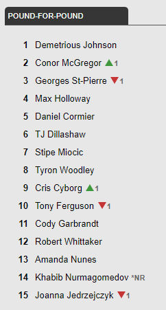 W rankingi P4P pojawił się największy zwycięzca gali w Las Vegas Khabib Nurmagomedov, torując sobie drogę na 14. miejsca i tym samym na 15. strącając byłą mistrzynię kategorii słomkowej Joannę Jędrzejczyk.