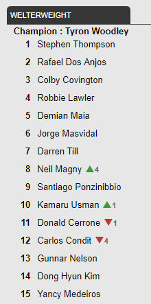 Największy awans – bo aż o cztery pozycje – zanotował Neil Magny, który dzięki zwycięstwu z Carlosem Conditem awansował z pozycji 12. na 8., zamieniając się w ten sposób miejscami z Urodzonym Zabójcą.