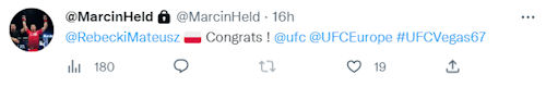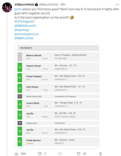 Aktualizacja: Marcin Held wyjaśnił w komentarzach na Facebooku, że osobliwy timing powyższego krytycznego wpisu pod adresem UFC wynikał stąd, że dopiero w trakcie walki Chińczyka z Nickiem Fiore zdał sobie sprawę z bilansu Amerykanina i pokonywanych przezeń rywali.