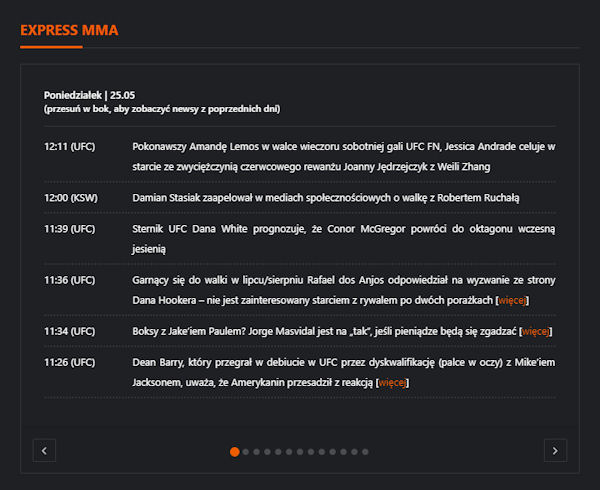 - UFC – ostatnie wiadomości związane z UFC (można przewijać w bok do kolejnych wiadomości)